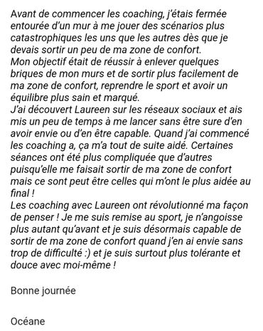 "J'ai commencé dès le premier jour à pratiquer les techniques apprises que ça soit au niveau mental ou physique comme la respiration et à travailler sur mes émotions et grâce au guide de Laureen, je commence à faire la visualisation de la bonne façon et je commence à me sentir plus détendue et plus sereine.[...]