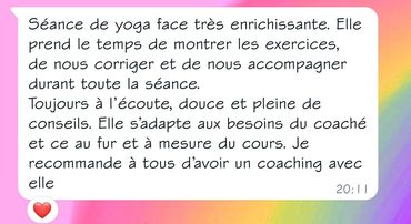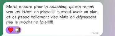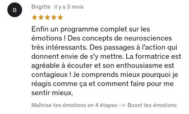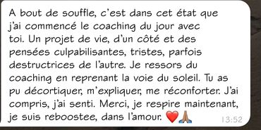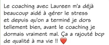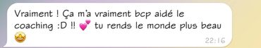[...] j'ai appris à comprendre mes émotions, les accepter et analyser ma manière de fonctionner pour mieux gérer les périodes de stress et d'anxiété. J'avais un blocage au niveau de mes relations amoureuses, amicales et familiales et ce coaching m'a permis de les améliorer.