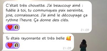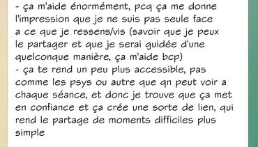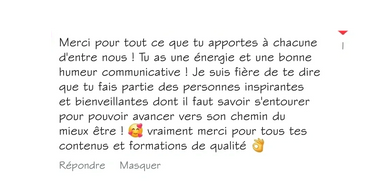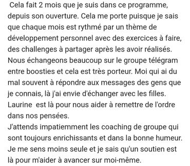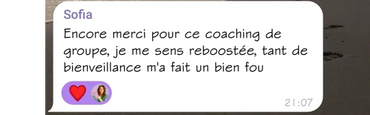 "Les échanges sont enrichissants, tu y apprends déjà des vraies techniques qui te donneront (maintenant ou plus tard) envie d’aller plus loin et d’être accompagnée. C’est un premier pas vers l’accompagnement et le mieux-être,