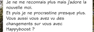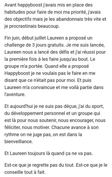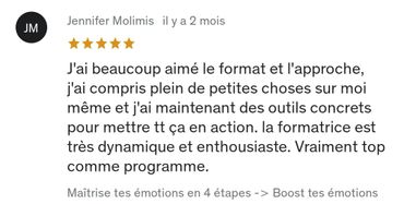 [ ...] je suis plus sereine, moins stressée, plus du tout anxieuse ! J'ai appris à soigner mes relations, gérer mon stress en prise de parole et prendre soin de moi. Mon plus gros problème était que je faisais toujours passer les besoins des autres avant les miens !