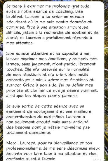 "Laureen m'a toujours comprise quand moi je ne savais pas mettre des mots précis sur mes ressentis. J'ai adoré nos rendez-vous hebdomadaires, elle m'a énormément aidé à analyser mes émotions et à les gérer afin de me sentir plus zen. Grâce à Laureen j'ai appris a posé mes limites et je me suis transformée en meilleure version de moi-même. "